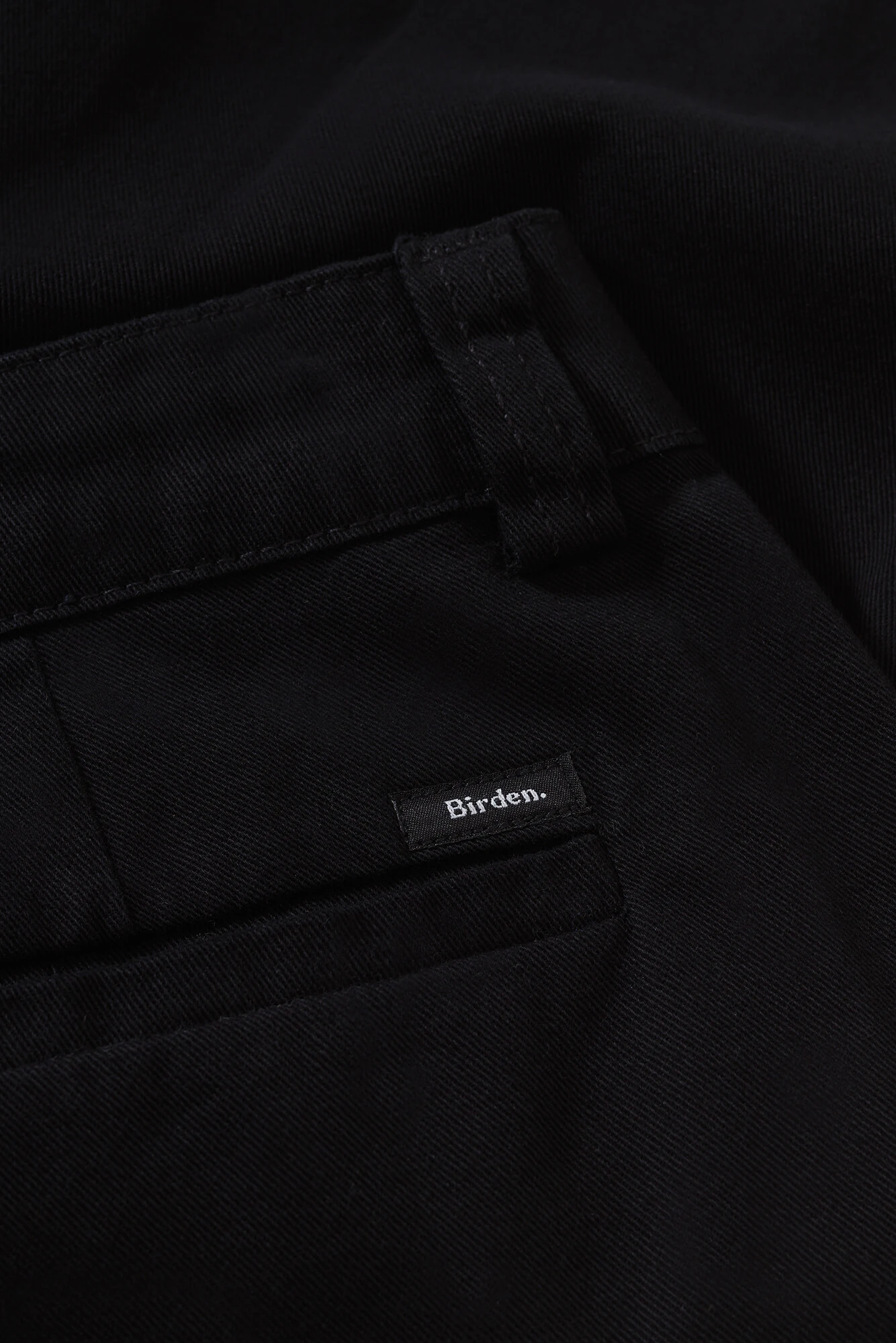 Possui bolsos laterais e traseiros embutidos com fechamento de botão na cintura.