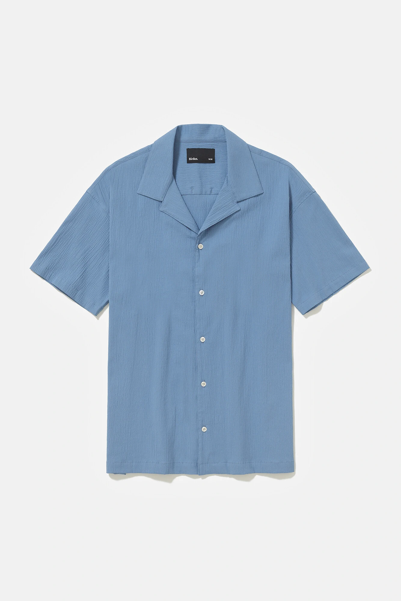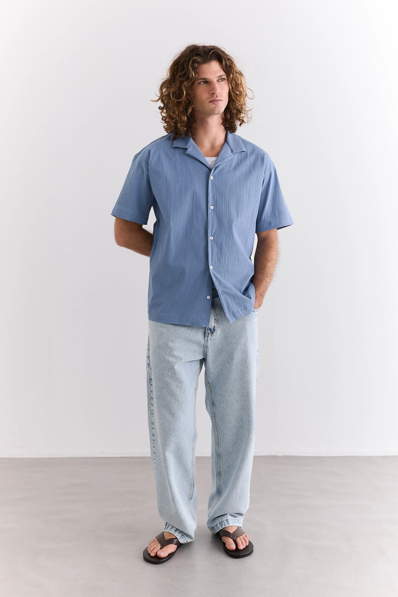 Camisa manga curta com gola cubana e modelagem boxy levemente mais curta no comprimento.