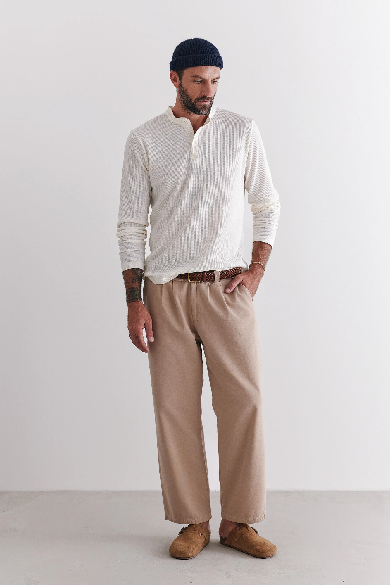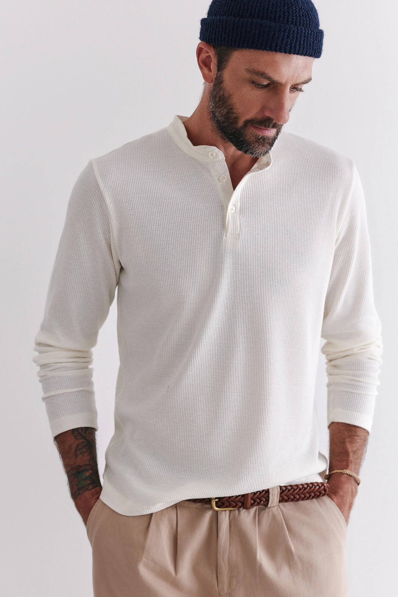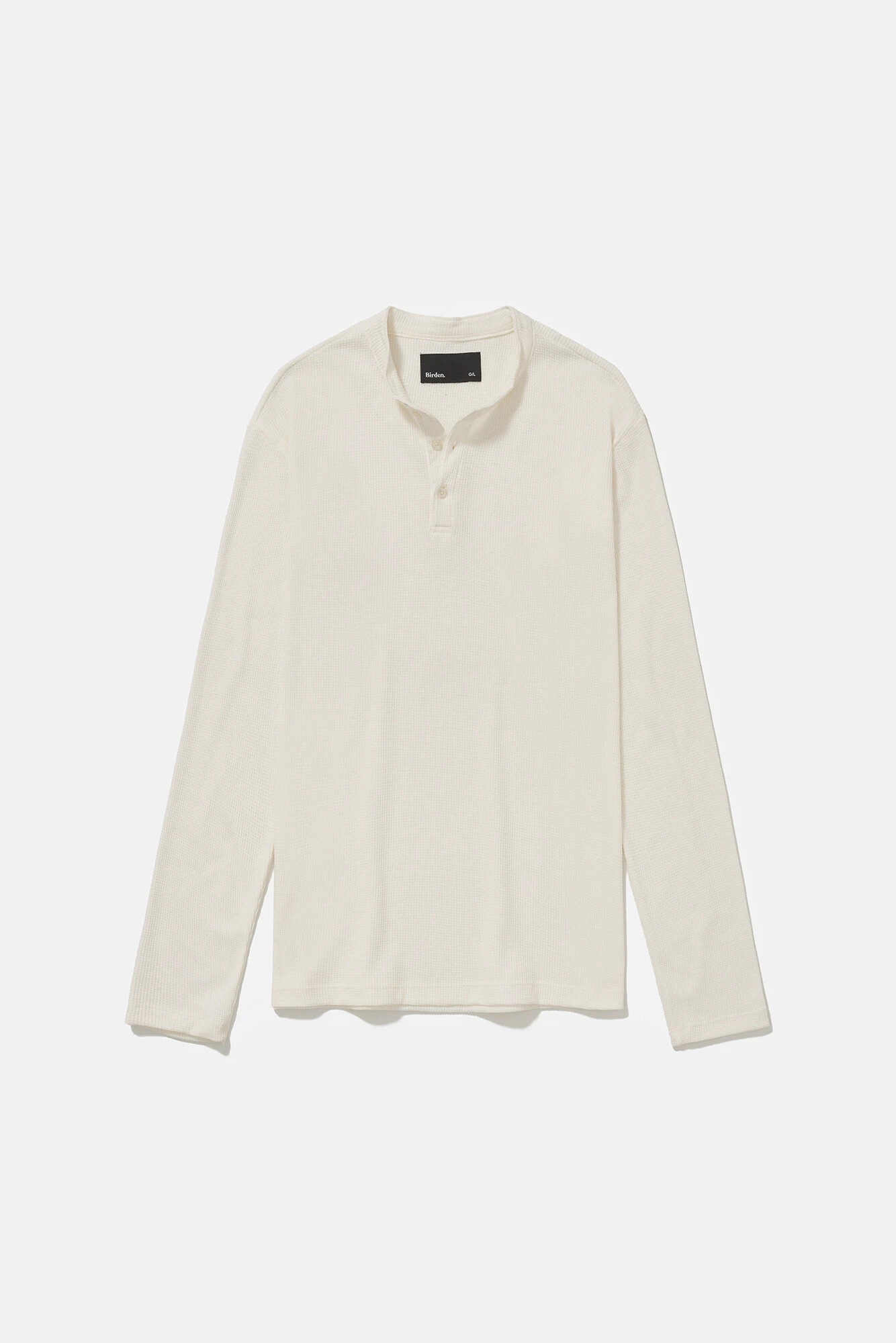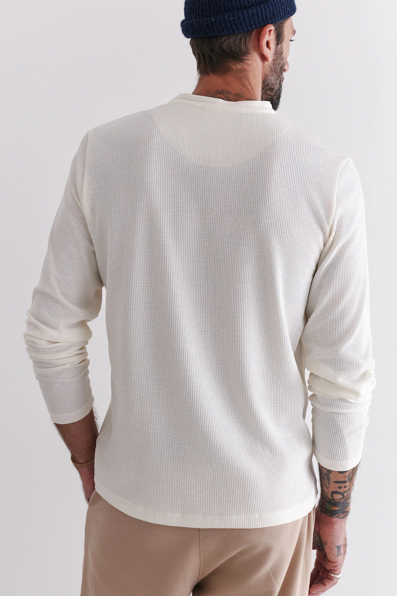 Camiseta Henley manga longa confeccionada em malha texturizada que traz profundidade visual e um toque sofisticado ao básico do dia a dia.