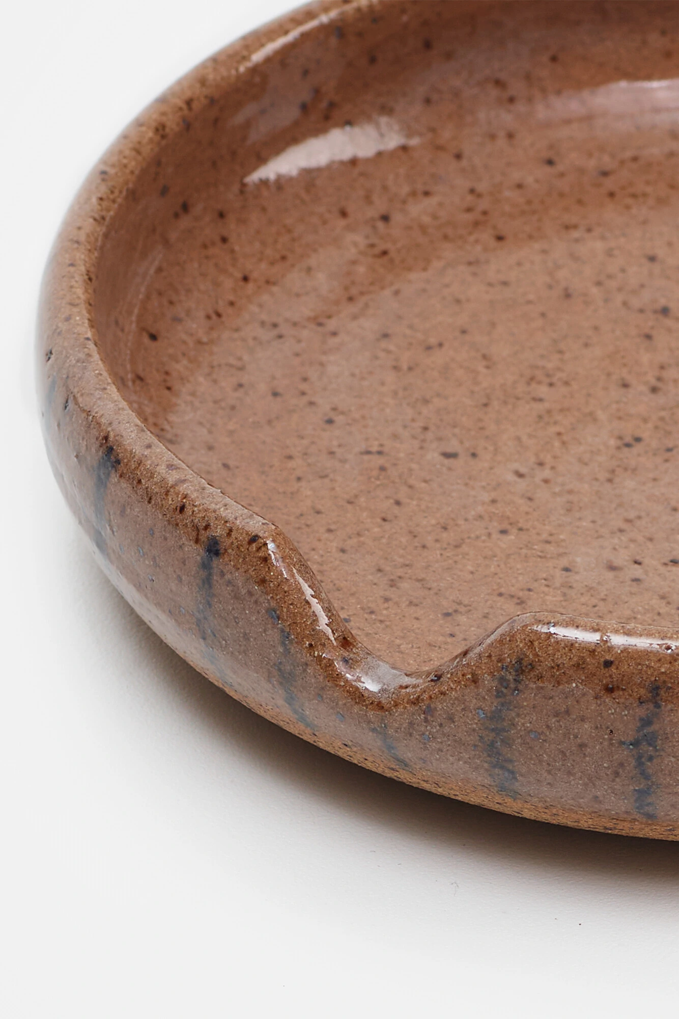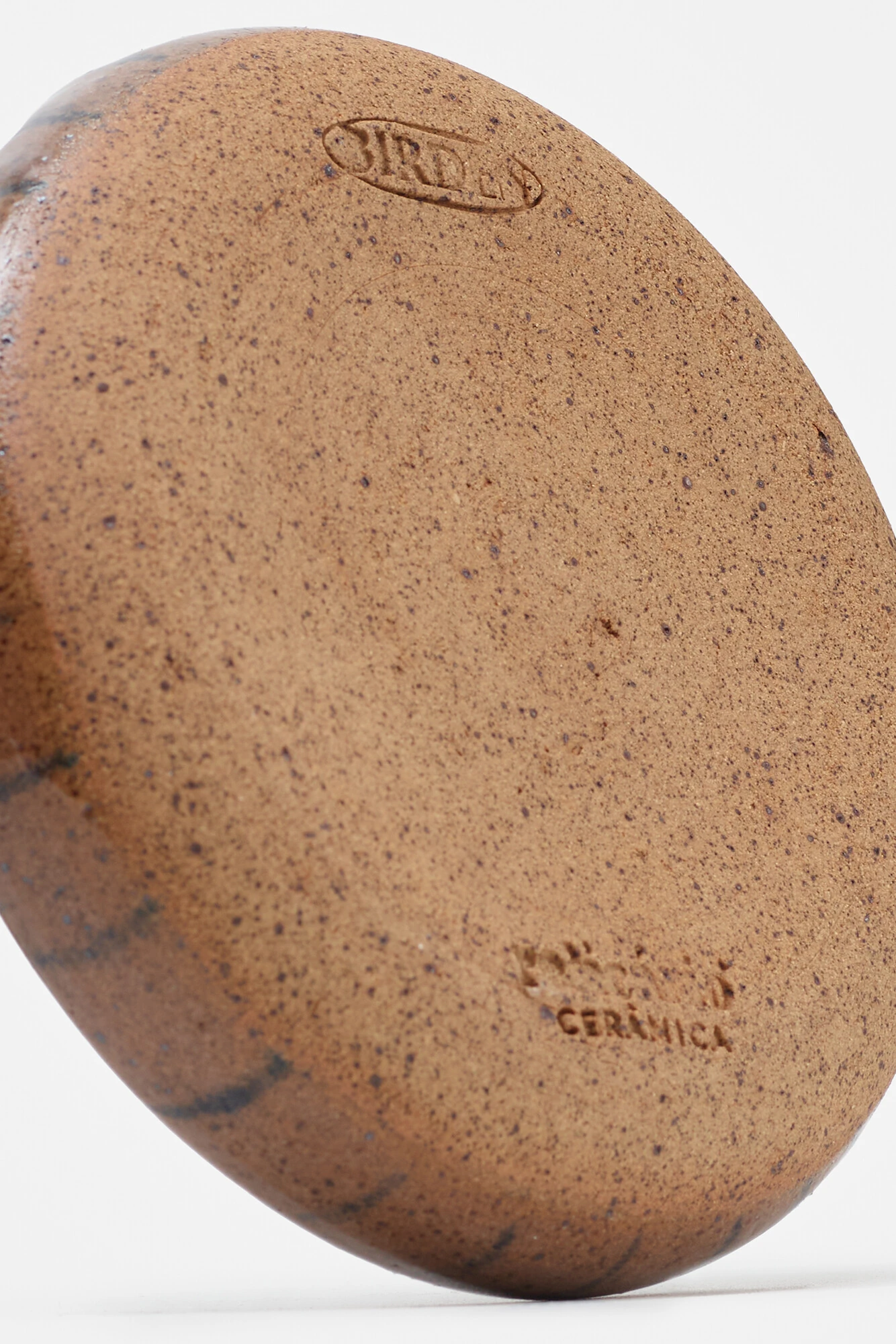 Cinzeiro em cerâmica com listras na parte exterior e acabamento artesanal. Um objeto funcional e atemporal, pensado para compor a mesa ou o ambiente com presença, textura e personalidade.