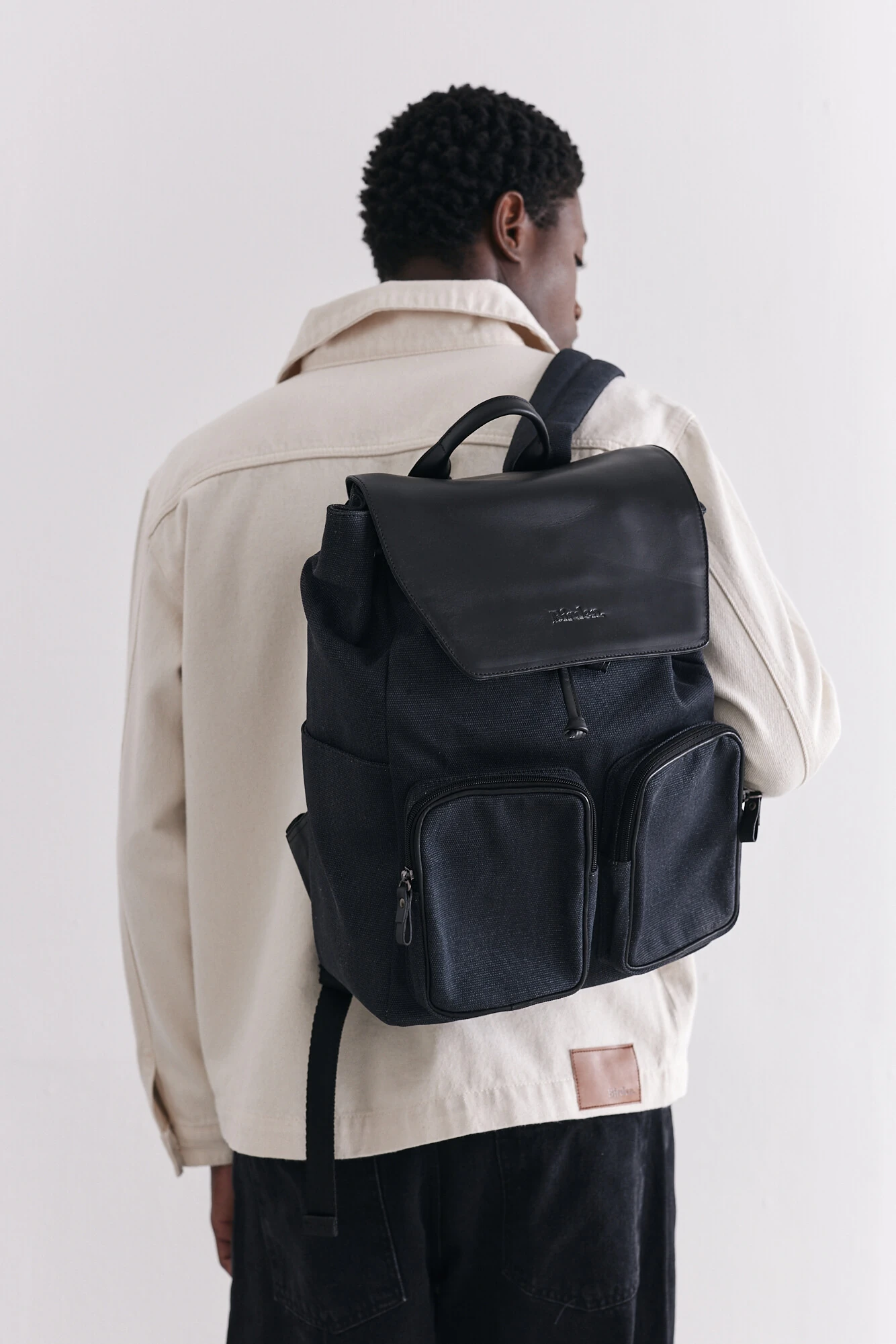 O contraste entre a textura da lona e a tampa em couro cria uma estética discreta e contemporânea, enquanto a estrutura reforçada garante segurança e organização para os itens essenciais. Os bolsos frontais externos facilitam o acesso rápido a pequenos objetos, e o fechamento superior com aba em couro reforça o visual minimalista da peça.