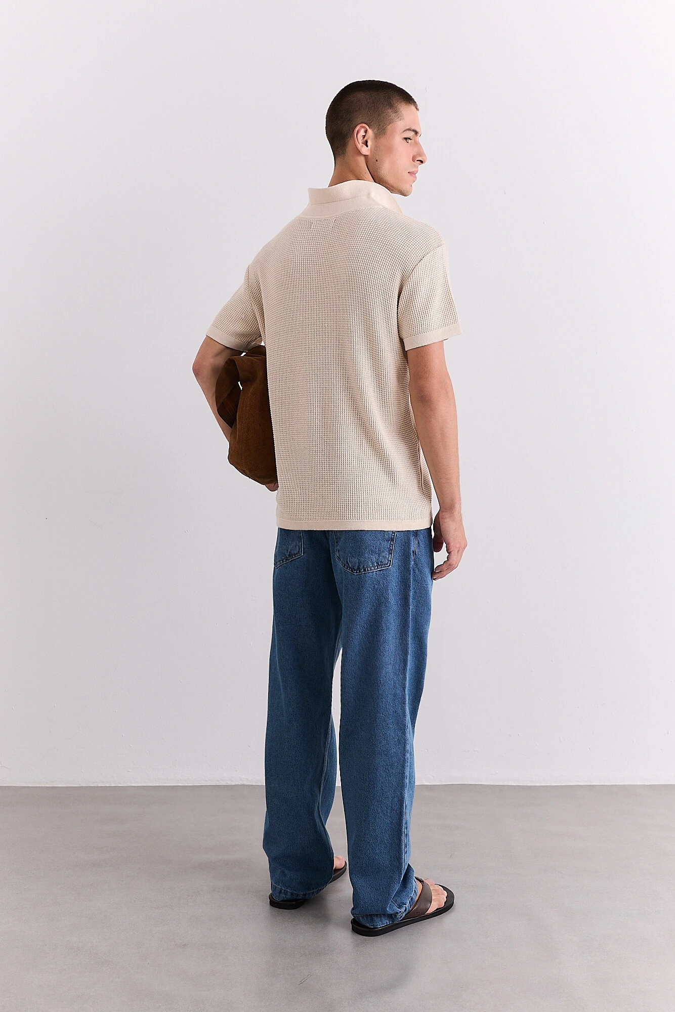 Polo em tricot estruturado com textura waffle, proporcionando toque macio, boa respirabilidade e aparência casual. Gola, punhos e barra canelados trazem um acabamento limpo e reforçam o visual refinado da peça.
