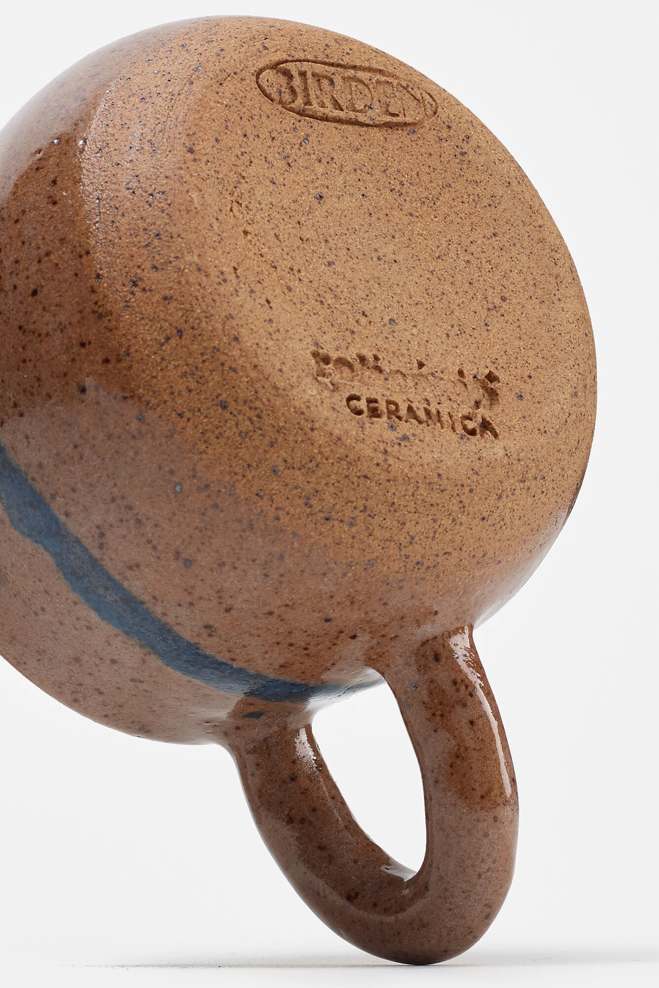 Peças produzidas em cerâmica artesanal de alta temperatura, queimadas a 1223°C, nas cores caramelo e azul